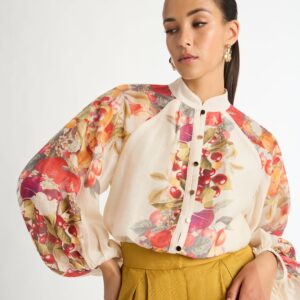 Bold fruity prints and soothing neutral colour ways. Introducing the Orchard Escape Shirt - showcasing a relaxed fit, short raglan sleeves and stand up collar neckline. Pair with our Argentina Linen Pant and Romy Earrings to complete the look.?~section~ Tencel blend non stretch fabrication Relaxed fit styling Fully lined body and sleeves unlined Raglan sleeve...
